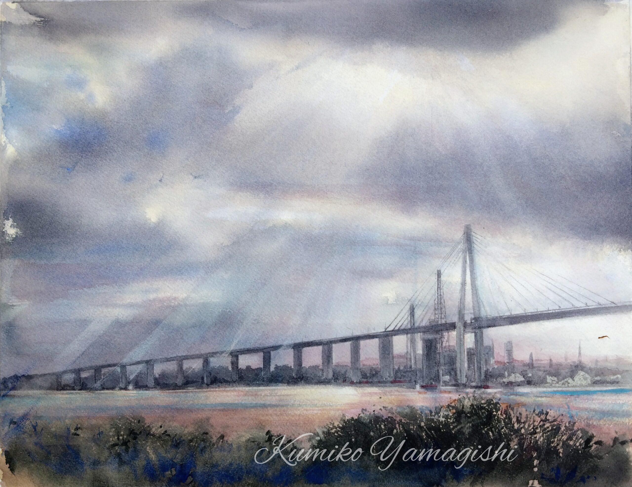 〈新湊大橋の朝日〉F6 アルシュ 水彩画